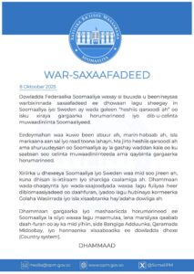 Dowladda Federaalka Soomaaliya waxay si buuxda u beenineysaa warbixinnada saxaafadeed ee dhowaan lagu sheegay in Soomaaliya iyo Sweden ay wada galeen “heshiis qarsoodi ah” oo isku xiraya gargaarka horumarineed iyo dib-u-celinta muwaadiniinta Soomaaliyeed.