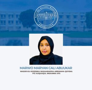 Ra’iisul Wasaaraha Xukuumadda Jamhuuriyadda Federaalka Soomaaliya, Mudane Xamsa Cabdi Barre, ayaa markii uu arkay khibradda, waayo-aragnimada iyo howsha baaxadda leh ee hortaalla Wasaaradda Arrimaha Qoyska iyo Xuquuqul Insaanka, waxa uu u magacaabay Marwo Maryan Cali Abuukar Wasiir ku-xigeenka Wasaaradda Arrimaha Qoyska iyo Xuquuqul Insaanka.