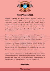 Muqdisho, February 05, 2026: Ciidanka Hay’adda Sirdoonka iyo Nabadsugidda Qaranka (NISA) ayaa ku guuleystay in ay shacabka Soomaaliyeed shartiisa dhaafiyaan Horjooge Axmed Dhubad Xidig oo magaciisa afgarashadu ahaa Sheekh Aadan Dheere, kaas Khawaarijta u qaabilsanaa Maaliyadda Gobolka Banaadir, kaddib howlgal si gaar ah loo qorsheeyay oo ka dhacay deegaanka Daniga Baaloow ee gobolka Shabeellaha Hoose, 27-kii Janaayo.
