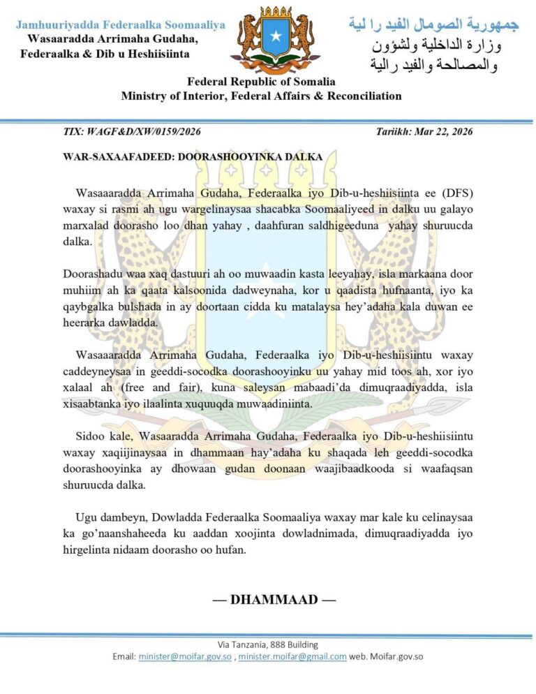 Wasaaaradda Arrimaha Gudaha, Federaalka iyo Dib-u-heshiistinta ee (DFS) waxay si rasmi ah ugu wargelinaysaa shacabka Soomaaliyeed in dalku uu galayo marxalad doorasho loo dhan yahay, daahfuran, saldhigeeduna yahay shuruucda dalka.