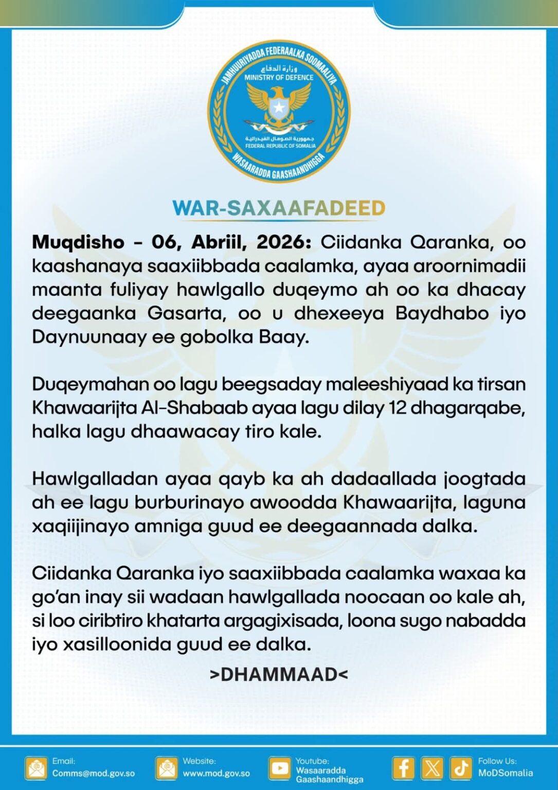 Ciidanka Qaranka, oo kaashanaya saaxiibbada caalamka, ayaa aroornimadii maanta fuliyay hawlgallo duqeymo ah oo ka dhacay deegaanka Gasarta, oo u dhexeeya Baydhabo iyo Daynuunaay ee gobolka Baay.